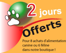 Pour tout achat d‘aliments chien ou chat dans notre boutique une carte de fidélité gratuite vous sera remise, qui quand elle sera pleine vous offrira deux jours de pension gratuite pour votre chat ou chien sans limite de temps pour l’utiliser .